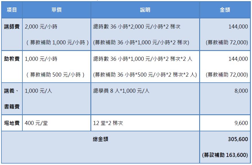 授課講師除了需有一般電腦相關知識外,在對視障者教學上,還須有分享專長、服務熱誠,此外,更要有視障教學的專業知識和經驗,故講師人選相較之下更為稀有。且視障學生因取得資訊需透過語音或點字的方式,故講義書籍得另手工轉譯製作成點字及形體觸摸版本,在電腦的輔具上也和一般學生需求有些不同,需另配置相關輔具,綜合上述,故相關費用會較偏高。(本次募款專案之電腦、相關輔具、及部分講師費,將由台北市視障者家長協會自籌。若有企業或善心人士欲給予協助,歡迎與協會聯絡)