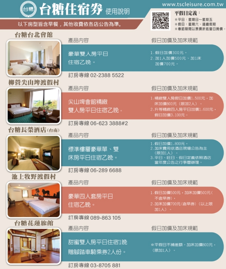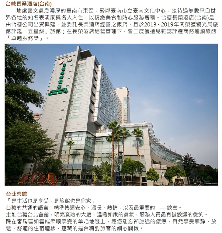 只要3499元,即可享有【台糖聯合住宿券】台北會館/柳營尖山埤渡假村/台糖長榮酒店(台南)/花蓮觀光糖廠/池上牧野
