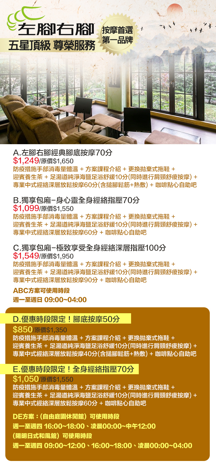 A.左腳右腳經典腳底按摩70分 / B.獨享包廂-身心靈全身經絡指壓70分 / C.獨享包廂-極致享受全身經絡深層指壓100分 / D.優惠時段限定!腳底按摩50分 / E.優惠時段限定!全身經絡指壓70分