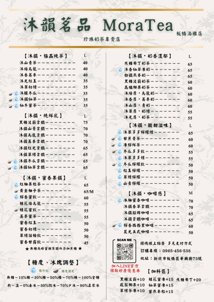 沐韻茗品 MoraTea位於新北市板橋區,綠白招牌清新醒目。主打現沖手作茶飲,飲品種類豐富多元且容易搭配。全品項提供客製化甜度、冰量,亦可加料升級,打造專屬風味。門市明亮整潔、點單動線順暢,通勤外帶更省時。不論是想清爽解渴或濃醇療癒都能被滿足,是日常外帶、午後放鬆與小聚配飲的貼心據點。