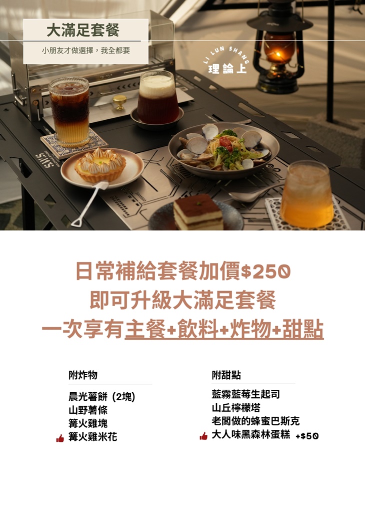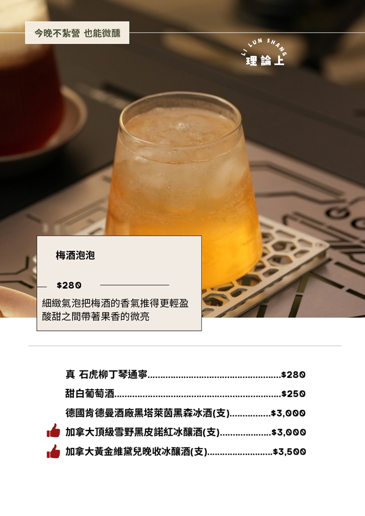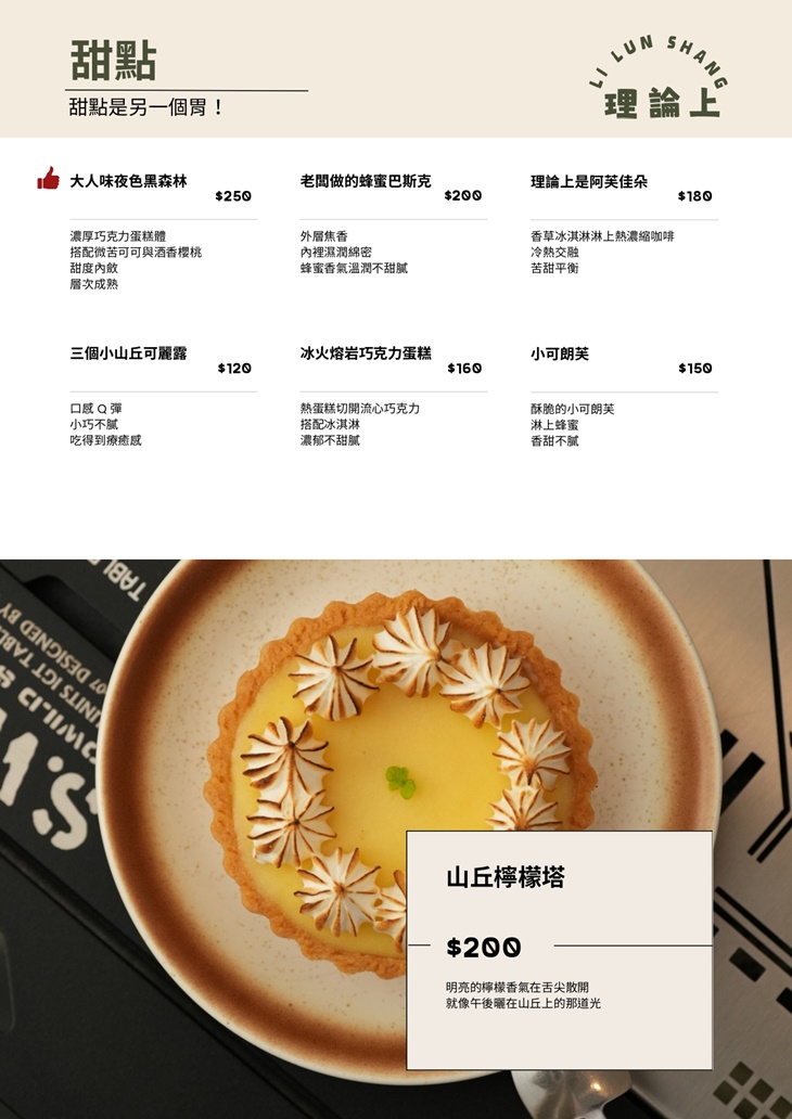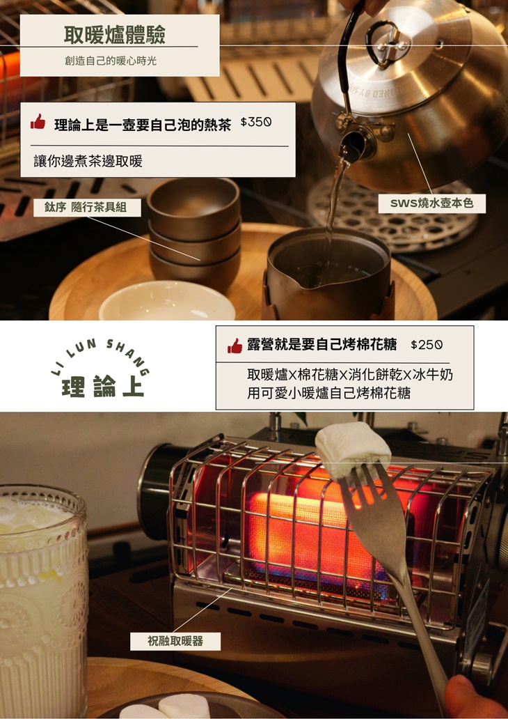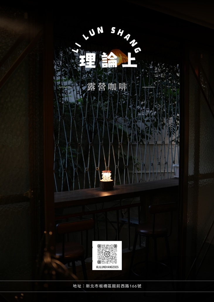 藏身板橋館前西路的「理論上 Li Lun Shang」,像是一座被城市包裹的小營地,一推開門就被帳篷、營燈與露營桌椅包圍,柔黃燈光灑在甜點櫃與手沖吧台上,氣氛溫暖而安靜。店裡主打義式早午餐與義大利麵,都以現點現做的方式呈現,份量實在、香氣迷人;想吃得輕盈一點,也有輕食搭配咖啡或特調飲品可以慢慢配。甜點櫃裡的各式甜點,一口就讓人理解「理論上會很好吃」這句玩笑背後的自信。晚上坐在陽台高腳椅,看著燈火與綠意發呆,或在帳篷裡圍著小暖爐品茶聊天,都很適合把時間交給這裡,好好放空。