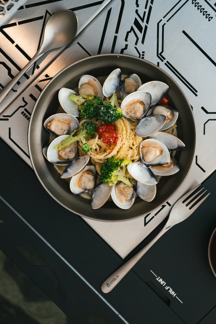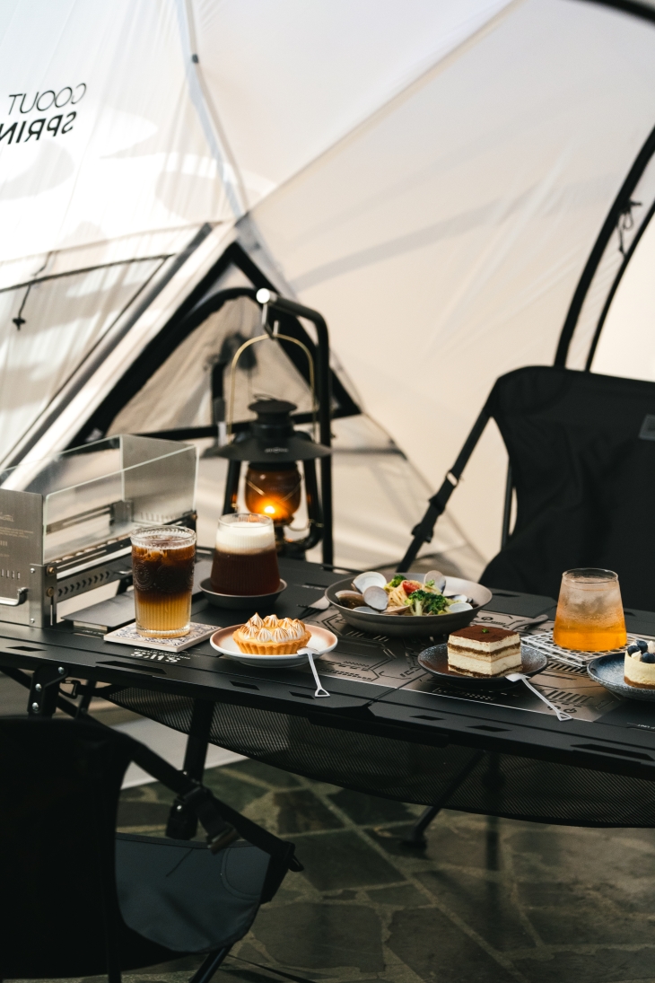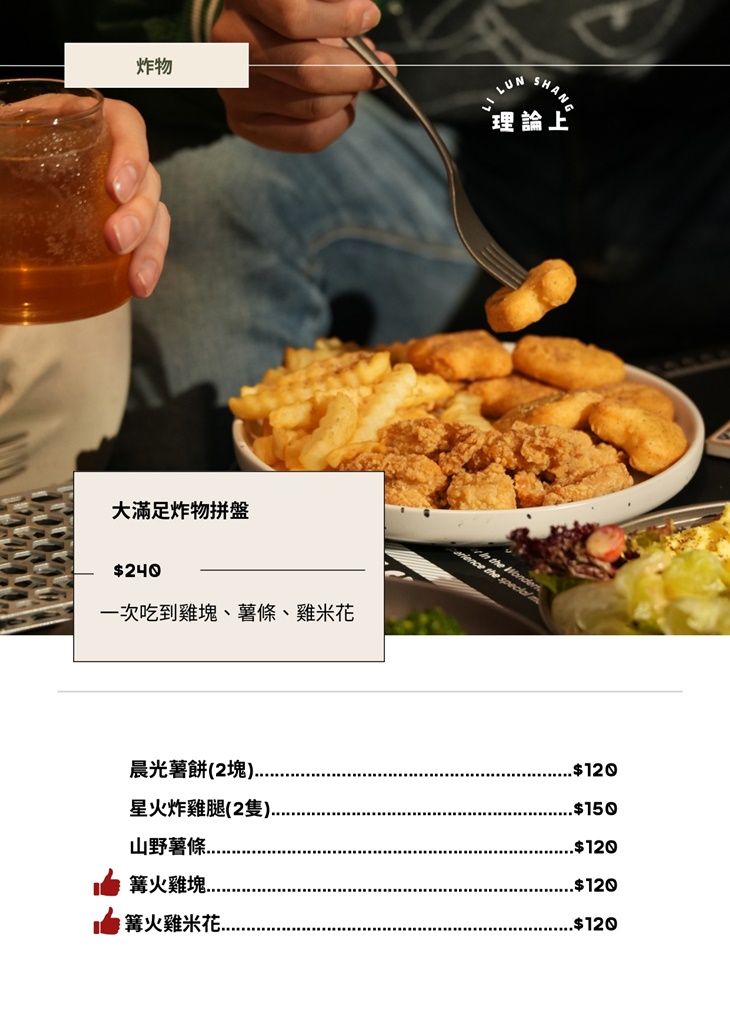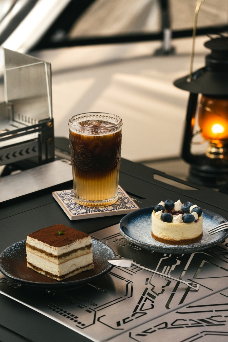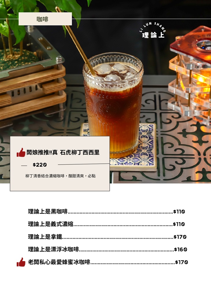 藏身板橋館前西路的「理論上 Li Lun Shang」,像是一座被城市包裹的小營地,一推開門就被帳篷、營燈與露營桌椅包圍,柔黃燈光灑在甜點櫃與手沖吧台上,氣氛溫暖而安靜。店裡主打義式早午餐與義大利麵,都以現點現做的方式呈現,份量實在、香氣迷人;想吃得輕盈一點,也有輕食搭配咖啡或特調飲品可以慢慢配。甜點櫃裡的各式甜點,一口就讓人理解「理論上會很好吃」這句玩笑背後的自信。晚上坐在陽台高腳椅,看著燈火與綠意發呆,或在帳篷裡圍著小暖爐品茶聊天,都很適合把時間交給這裡,好好放空。