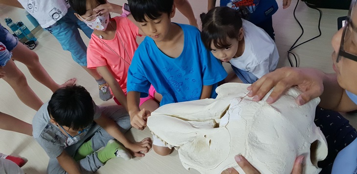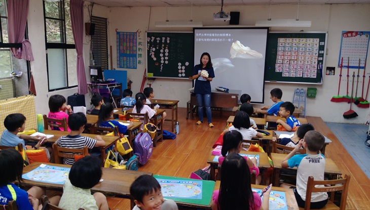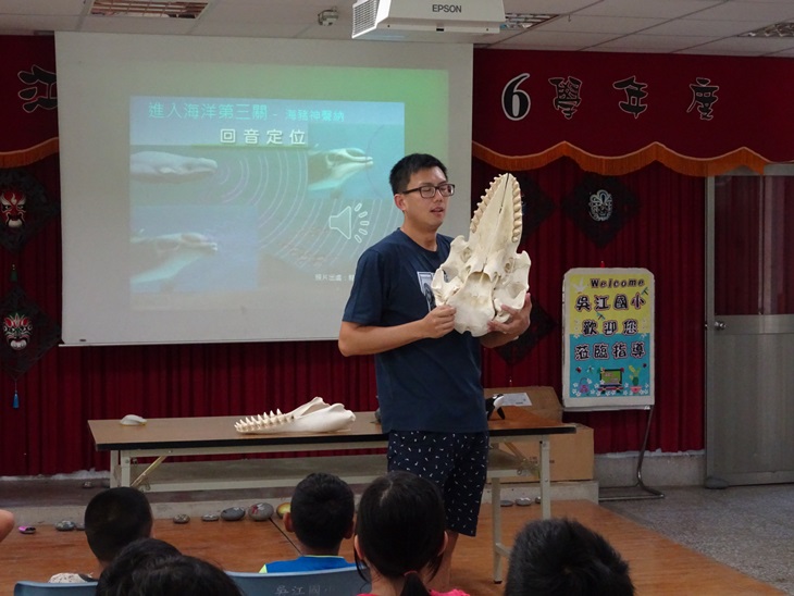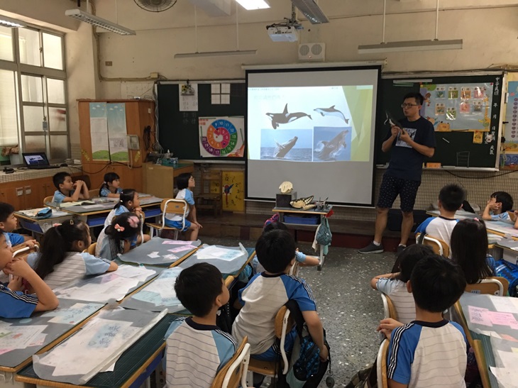 去年(107年)的5月,我們前往新北市的大觀國小,分享結合了鯨豚聲音與鯨豚生活的專業教案,包含鯨豚如何用聲音看世界、如何用聲音覓食、如何用聲音表達溝通,以及海洋噪音是如何影響著鯨豚生活等。
