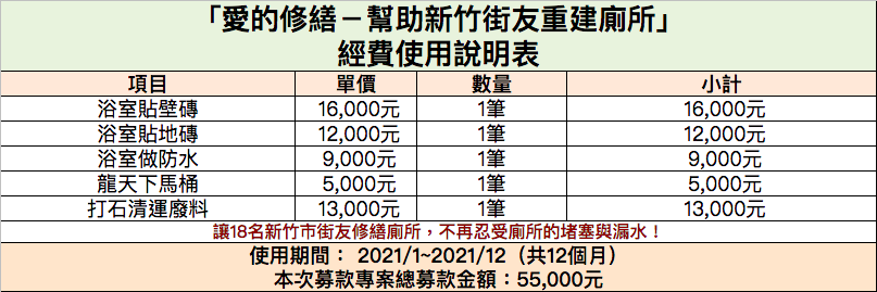 ◎專案摘要:讓18位新竹市街友修繕廁所,不再忍受廁所的堵塞與漏水!