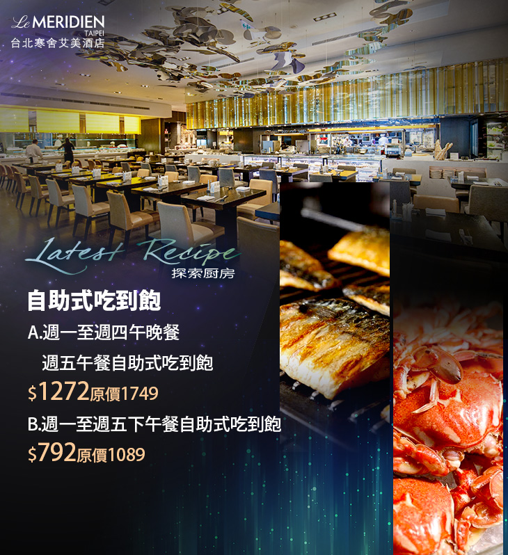 採用開放式自助餐檯與單點兼具的新潮用餐方式,菜樣豐富,從前菜的沙拉,到主食的爐烤比薩、現煎牛排,以及餐後甜點等,都是主廚團隊富滿巧思的創意美味。同時,為了控管食物品質,更隨時更替菜色,僅選用當季最新鮮、肥美的食材料理,看那專業的廚師團隊在您眼前俐落地烹調著每一道餐,令人驚豔的手藝,看得著迷不已!探索廚房,讓品嚐美食成為一種華麗的感官饗宴,開啟自助餐的全新視野!