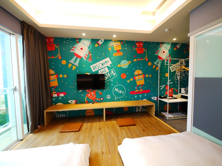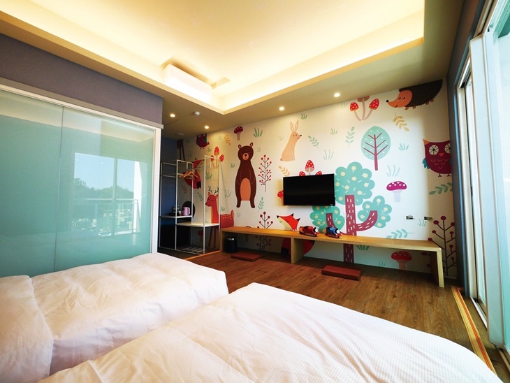可愛的圖畫讓整個客房空間更加活潑,大面景觀窗透進溫暖陽光,溫馨氛圍環繞四周,讓人身心自然舒放,房內備品則一應俱全,假期就該如此悠閒無拘!