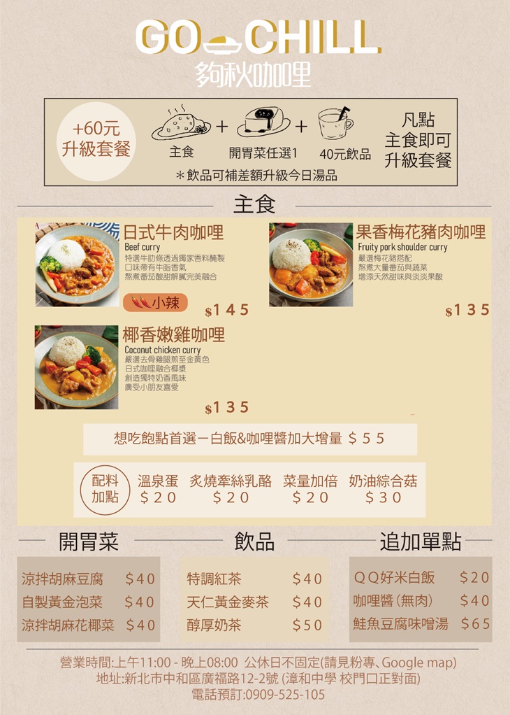 目前主打 3款風味咖哩,每一款醬汁都加入嚴選天然進口奶油製成的奶油炒麵糊,香氣濃郁卻不厚重,搭配每日現切配送的鮮蔬,還有鮭魚味噌湯、有機溫泉蛋等配料可加購,讓你的咖哩飯更豐盛、更滿足。