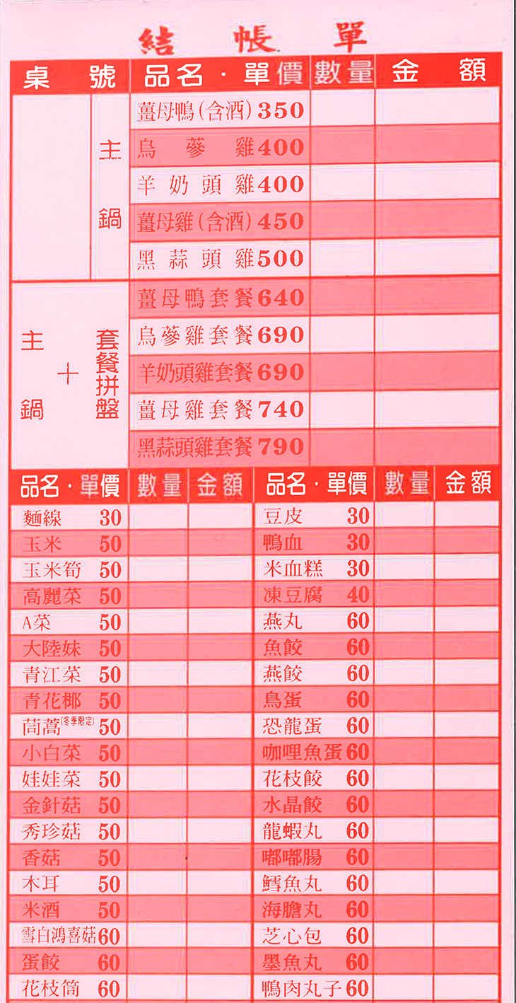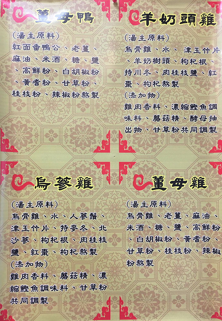 薑母鴨、烏參雞、羊奶頭雞、薑母雞、黑蒜頭雞、恐龍蛋、海膽丸、起司明太子、龍蝦沙拉丸等