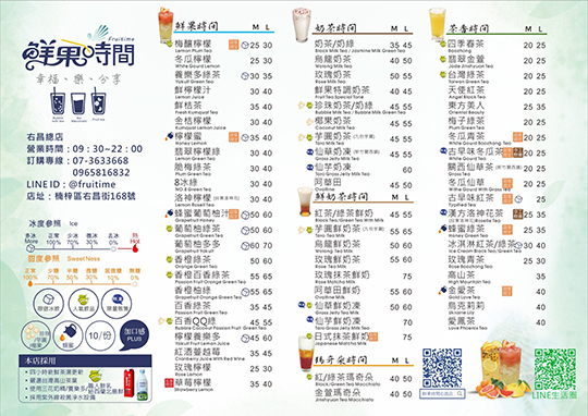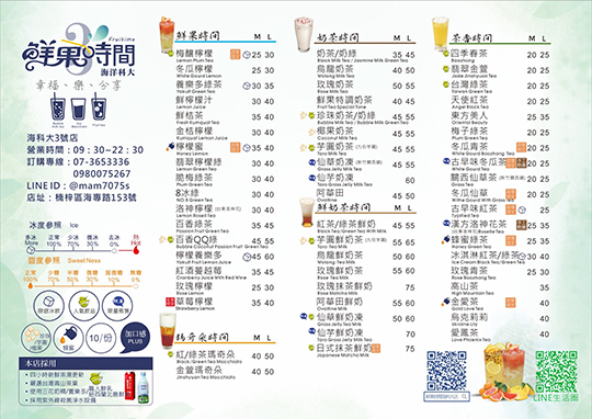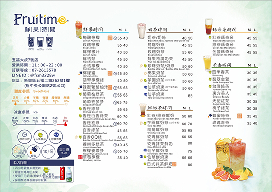 如果三餐沒時間吃水果,就讓專業的來,交給〝Fruitime 鮮果時間〞。為高雄地方好店,堅守新鮮鐵則,每日為你〝精一杯 (せいいっぱい)〞。日文的精一杯,即是竭盡所能之意,〝Fruitime 鮮果時間〞遵循嚴謹製作、歡樂服務的態度不遺餘力作好每一杯時令風味,補充滿滿的活力、維生素,照顧你生活在外的健康, 一塊開心分享鮮味的幸福感。