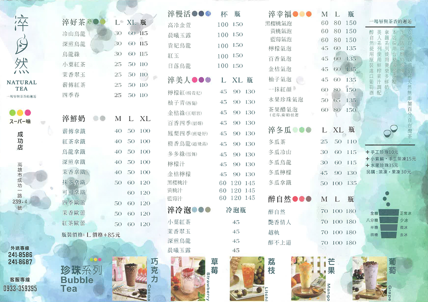 位於高雄市苓雅區成功一路 239-4 號的淬自然,專營新鮮飲品,堅持取之自然的原汁原味,一年四季皆可享用,紅茶拿鐵、茉香歐蕾、冷山烏龍等樣樣推薦,杯杯美味!此外店內裝潢也十分有巧思,本次推出折抵優惠,要搶要快,機會難得。
