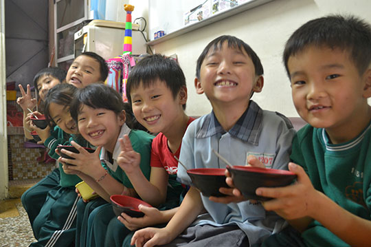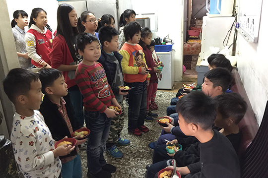 放學了,一群小朋友聚集到以琳,享用協會提供的愛心營養餐點、進行課業學習。