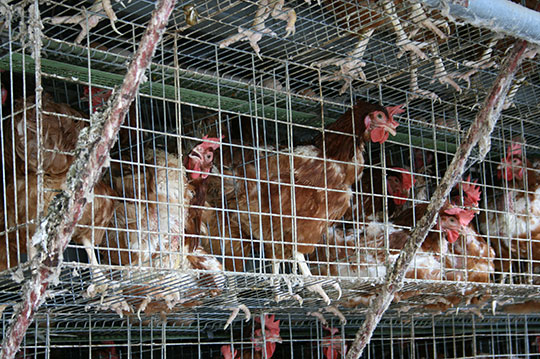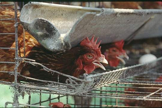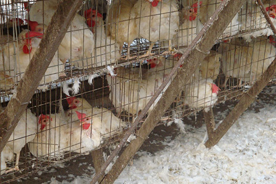 「格子籠」的前方是飼料槽和集蛋槽,雞必須從籠子的空隙中伸出脖子來吃飼料,以致該處羽毛幾乎被磨光。為了集蛋方便,籠面向前傾斜,母雞為了站穩在細鐵絲上,腳趾必須不斷磨擦、施力,趾墊因此過度角質化,容易裂開、感染。