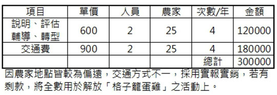 本募款專案總目標300,000元,款項使用期間為2018年1月至2018年12月,計畫促進更多蛋農投入友善生產,一年內再讓10萬隻蛋雞從窄小的格子籠裡獲得解放,讓牠們能自在張開雙翼,展現動物自然行為,在身心健康的狀態下,生產出健康、安全的雞蛋。