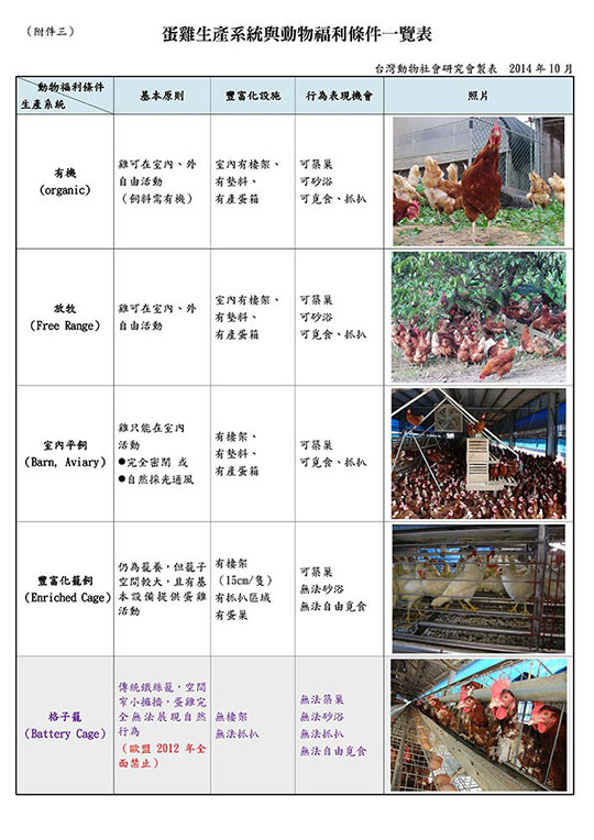 → 2014年1月更推動農委會公布「雞蛋友善生產系統定義與指南」,明確規範台灣放牧、平飼、豐富化籠飼三種友善生產系統的基本設施與管理要項。
