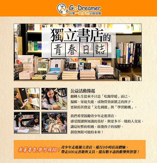 現在就邀請您一起支持【一起夢想-獨立書店的青春日誌II】系列活動,幫助孩子「乘著書香,夢想飛翔」!