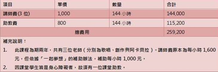 您的100元將100%用於【一起夢想-伴隨我走世界的下一步】公益專案:支持具備表演藝術才能的身心障礙者,組成阿卡貝拉合唱團與爵士輕音樂團,讓他們穩定就業、改善困境、減少家庭與社會的負擔。本專案募款259,200元,服務近20名不同類別身心障礙表演者的訓練費,款項使用期間為2018年12月至2019年5月。