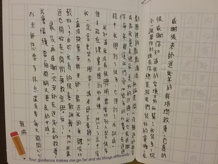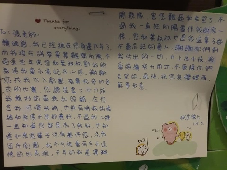 小涵在小學五年級時被老師推薦到向陽兒童劇團,因父母離異,媽媽打零工維生,家中經濟狀況不好的她一口氣免費參加了舞團與太鼓隊兩個班,非常投入,是劇團很重要的一份子。每次演出媽媽總是幫忙搬鼓,感謝劇團對孩子們的栽培。後來小涵離開舞團上了高中,三年來不但繼續跳舞,更力爭上游,今年剛考上台東國立大學教育系,最大的希望是想幫忙更多孩子們成就夢想。