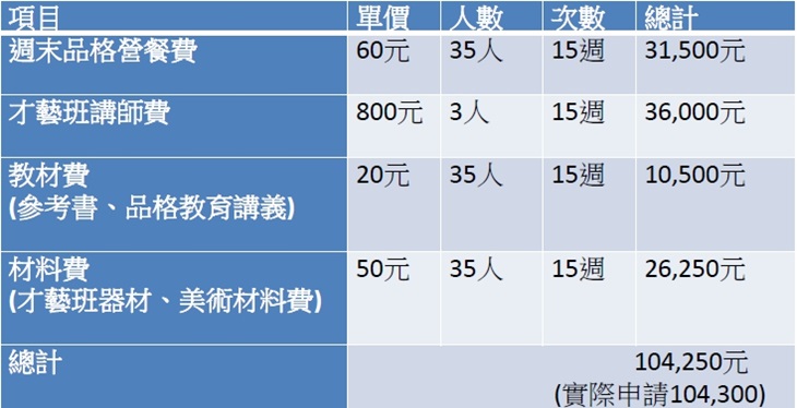 每週六下午則聘請專業的才藝老師,開設兒童營,包含品格教育以及才藝課程(美術班、美勞班、爵士鼓班、圍棋班、兒童律動班),讓孩子可依照自己的興趣選擇參加,希望藉由多元豐富的課程,讓孩子看見自己的長處和優勢,培養弱勢家庭孩子的自信心。