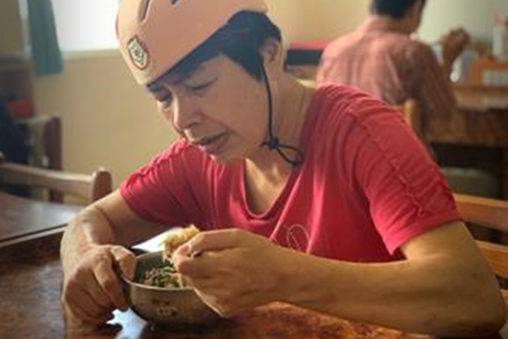 (使用助行器的阿鳳,每天除了練習扶著欄杆行走之外,吃飯也是阿鳳生活自理練習的一部分)