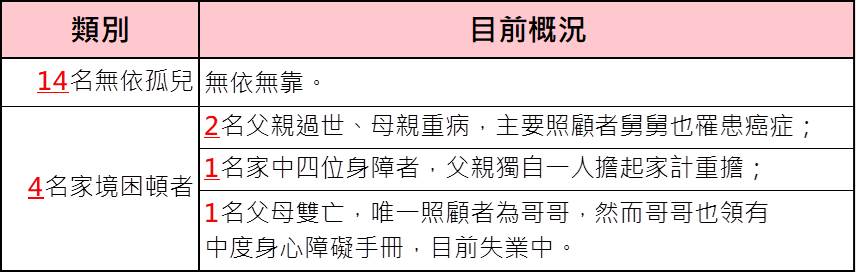 ◎專案服務對象:無依孤兒、家境困頓的心智障礙者。