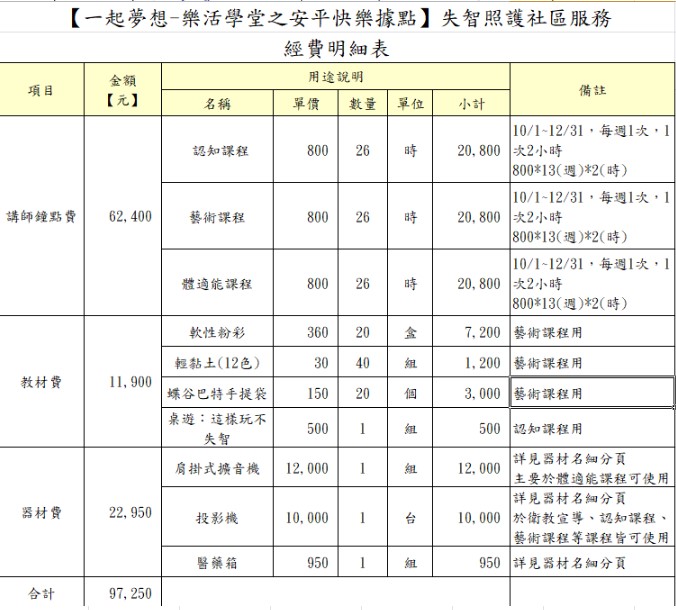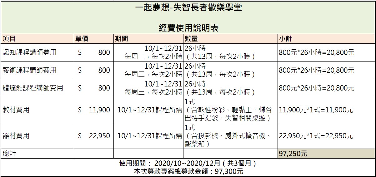 ◎專案摘要:透過專案募集經費,提供台南地區失智症確診、疑似罹患失智症長者藝術、體適能、認知課程之費用,以利於減緩大腦退化的速度。