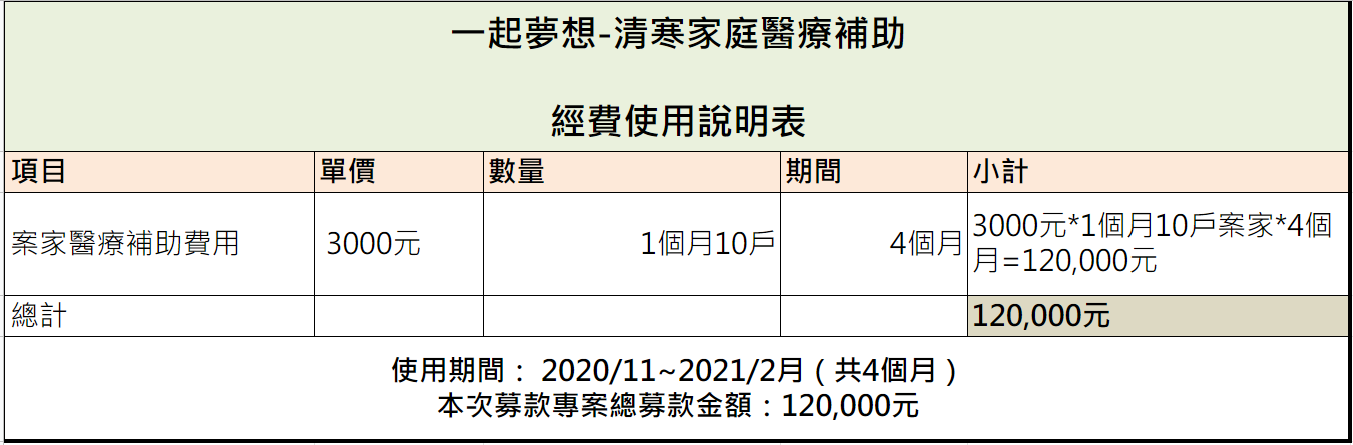 ◎專案摘要:提供高雄市經濟弱勢且有醫療需求之案家一個月3000元之醫療補助,案家主要經當地里幹事或醫院、以及協會會員轉介之清寒家庭,並由協會社工前往評估後予以補助。