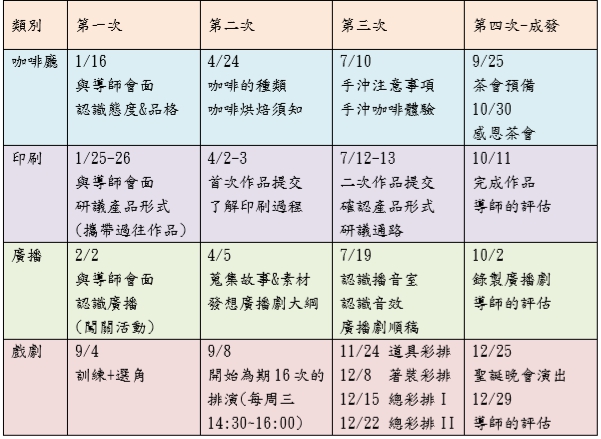 (職業體驗課表,每個類別預計辦理四次,每季一次)