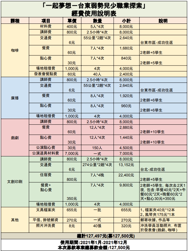 ◎專案摘要:藉由方案協助台東偏鄉地區的弱勢家庭兒少探索咖啡、廣播、戲劇、文創印刷等行業,透過導師的陪伴學習相關所需的能力,拓展偏鄉孩子對未來職業的多元選擇,翻轉貧窮!