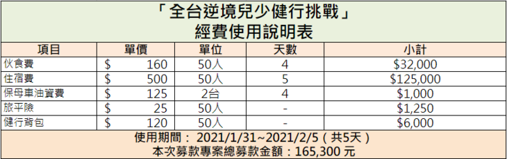1. 本次活動全部經費約為35萬,使用一起夢想募資平台募集部分費用專款專用。
