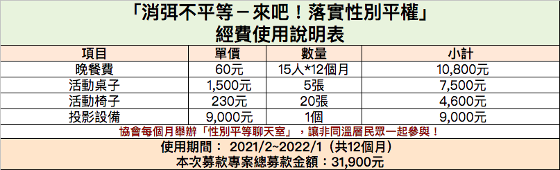 「性別晚餐聊天室」每個月都舉辦一場,未來將在協會能自行運用的場地,但是苦於場地的桌椅、設備皆欠缺,加上協會平常並未積極對外募款,因此這次希望大眾能給予支持!