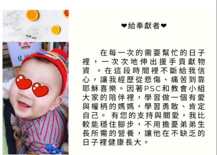 社團法人台灣家庭生命關懷協會的陪伴下,提到這個即將到來的孩子 Flora 說到:想著等孩子一出生要趕緊兼兩份工作來照顧孩子,希望能給予這個孩子比她更好的成長環境,陪伴著孩子長大,給他關懷與滿滿的愛!社工伊雯表示:如同 Flora 一樣遭遇困境的弱勢懷孕婦女需要更多的支持與協助,而他們也在經歷這段過程中,學習勇敢,重新調整自己的生活。我們給她們更多的肯定,希望能陪伴他們一起面對困境,迎向更好的未來!
