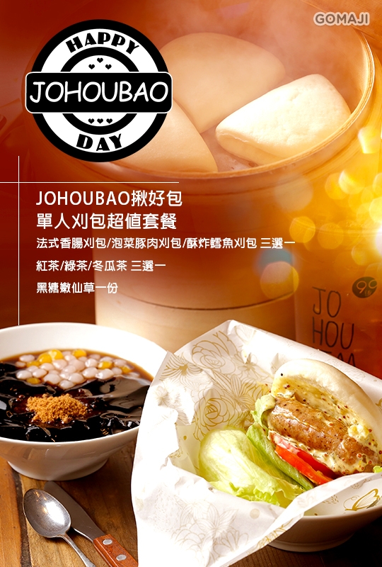 JOHOUBAO揪好包單人刈包超值套餐:法式香腸刈包/泡菜豚肉刈包/酥炸鱈魚刈包 三選一 + 紅茶/綠茶/冬瓜茶 三選一 + 黑糖嫩仙草一份