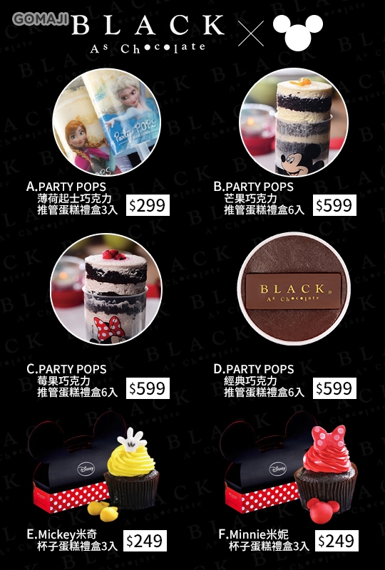A.PARTY POPS薄荷起士巧克力推管蛋糕禮盒一盒(三入) / B.PARTY POPS芒果巧克力推管蛋糕禮盒一盒(六入) / C.PARTY POPS莓果巧克力推管蛋糕禮盒一盒(六入) / D.PARTY POPS經典巧克力推管蛋糕禮盒一盒(六入) / E.Mickey米奇杯子蛋糕禮盒一盒(三入) / F.Minnie米妮杯子蛋糕禮盒一盒(三入)