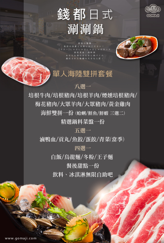 店家提供多種精緻肉品,份量十足的肉盤令人眼睛為之一亮!和一大群人吃火鍋總讓你覺得擁擠又難以下嚥嗎?來到錢都,寬敞舒適的座椅給您最佳的用餐環境,一人一鍋的日式涮涮鍋,可以放慢腳步,一片片的慢慢吃肉喝湯,品嘗香熱美味的口感,價格優惠又划算!