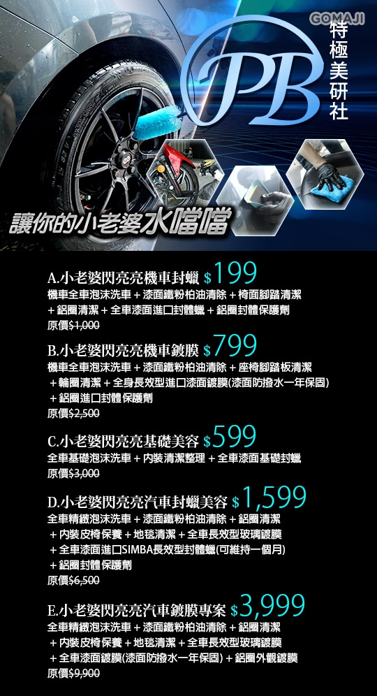 A.小老婆閃亮亮機車封蠟 / B.小老婆閃亮亮機車鍍膜 / C.小老婆閃亮亮基礎美容 / D.小老婆閃亮亮汽車封蠟美容 / E.小老婆閃亮亮汽車鍍膜專案