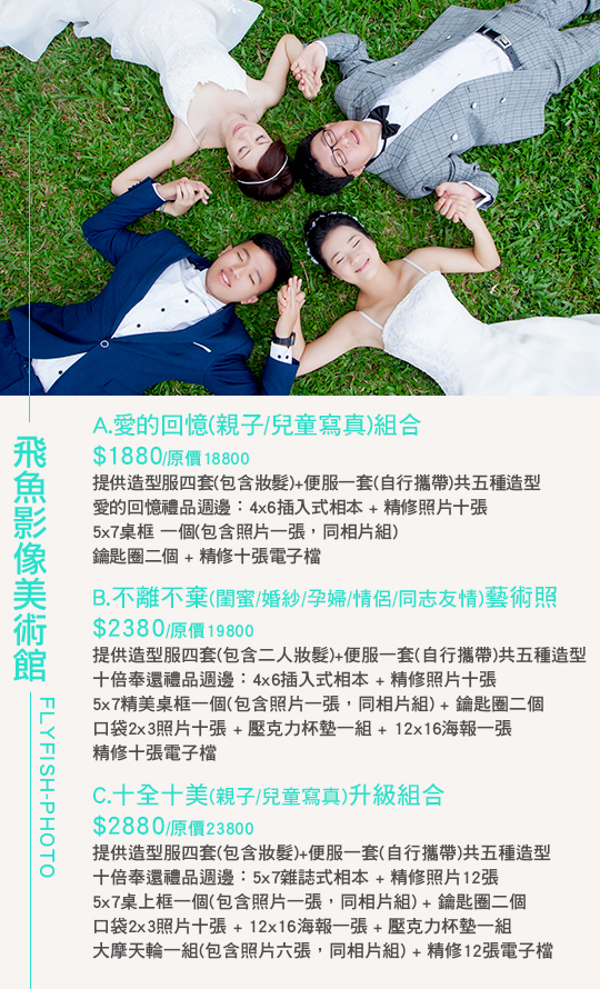A.愛的回憶(親子/寳寳兒童寫真)組合 / B.不離不棄(閨蜜/婚紗/孕婦/情侶/同志友情)藝術照 / C.十全十美(親子/寳寳兒童寫真)升級組合