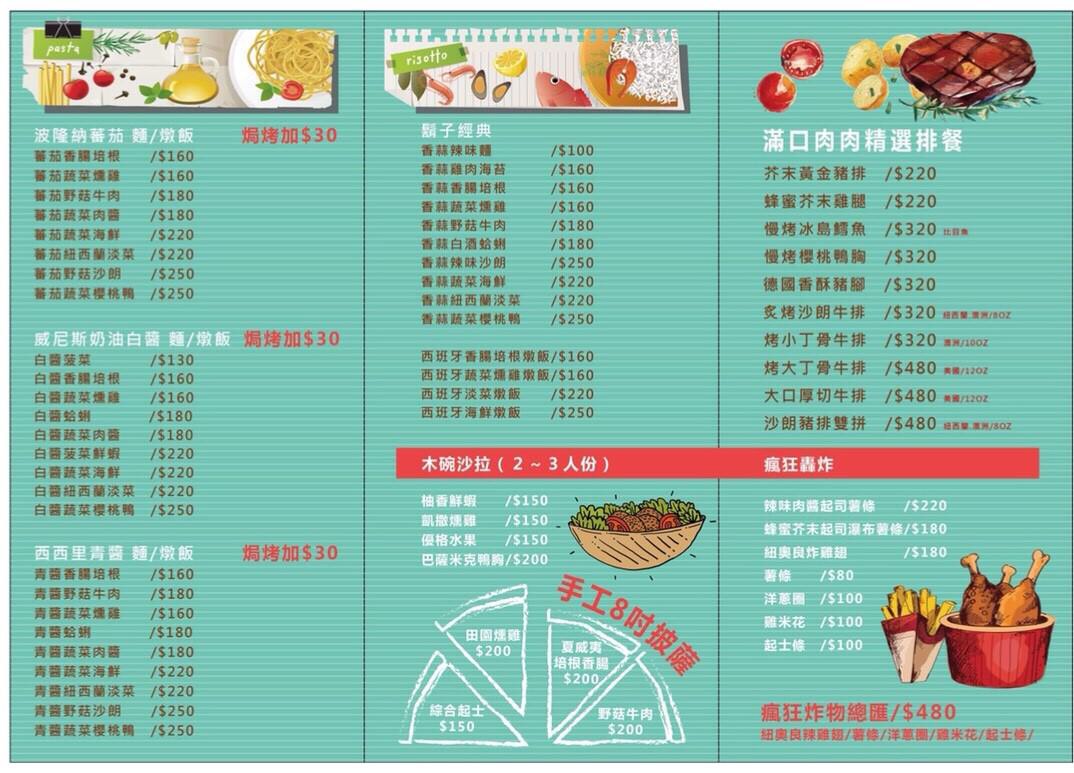 嚴選食材品質,堅持採用每日新鮮食材、誠心料理每道料理,提供義大利麵、燉飯、焗烤、披薩、小點、特調飲品等;將精緻的義式料理口味大眾化、推出種類選擇多樣性,真材食料的美味料理,以滿足每位饕客對義式美食的講究與需求,絕對帶給您最難忘的品味感動。