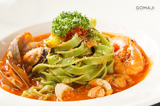 以鮮紅蕃茄製作清甜醬汁,加入鮮蝦、蛤蜊等海鮮配料,來自田野與大海的自然風味,在主廚精確的火候掌控下完美結合,呈現和諧的細緻口感。