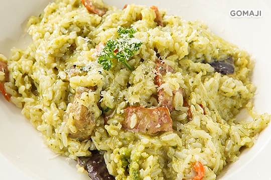 精心調配的青醬醬汁、香氣十足的香腸&培根,每一口都散發著九層塔的獨特香氣,多重美味的交融,更加提升了整道料理的美味與口感。