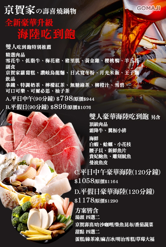 A.雙人平日中午吃到飽(90分鐘) / B.雙人平假日吃到飽(90分鐘) / C.雙人平日中午豪華海陸吃到飽(120分鐘) / D.雙人平假日豪華海陸吃到飽(120分鐘)