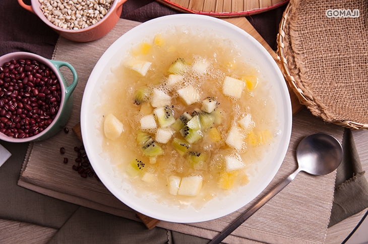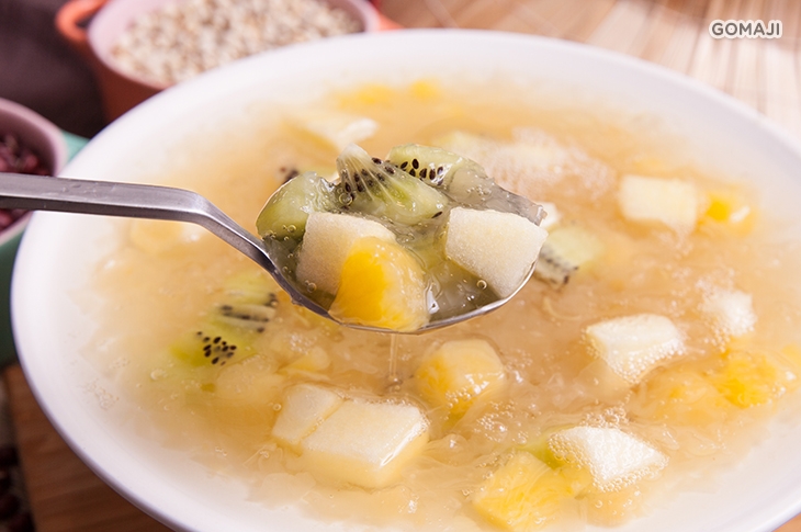令人感到纖味十足的鮮果銀耳湯,主要以切丁的奇異果、蘋果、鳳梨混合脆口的銀耳所製成,冰涼酸甜且滑順的口感,讓人印象深刻!