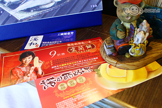 住宿即贈網路大賣、媒體爭相報導的人氣甜點諾貝爾奶凍捲9折券一張,12種口味讓你不知從何選擇,盒上印著象徵宜蘭風情的美景。與宜蘭餅9折券一張 ,分送伴手禮,讓你送禮超有面子!