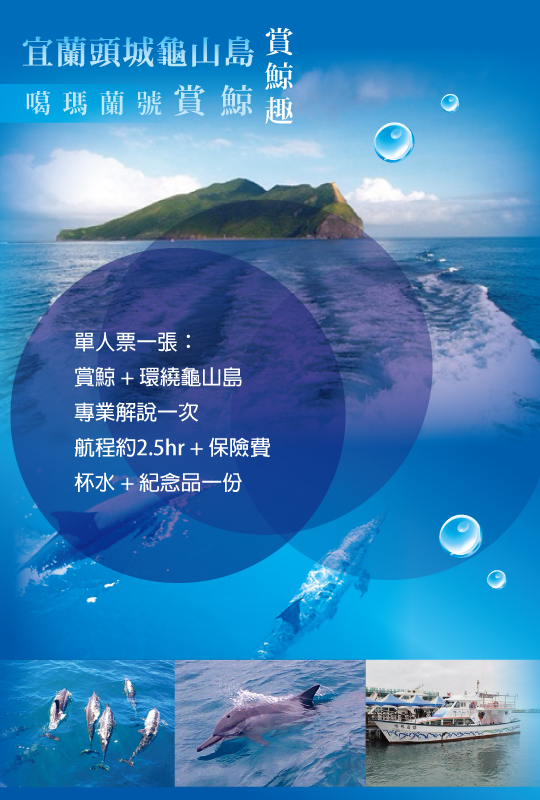龜山島不僅是台灣三大漁場之一,也是鯨、豚迴遊必經之路。因此來到這裡,既能欣賞到可愛的鯨豚在海中跳耀,同時也能觀賞到整座龜山島的美麗景色。看著湛藍海水,奮力躍起的鯨魚和海豚,讓我們跟隨著牠們的腳步,航向龜山島,與牠們一起共舞吧!