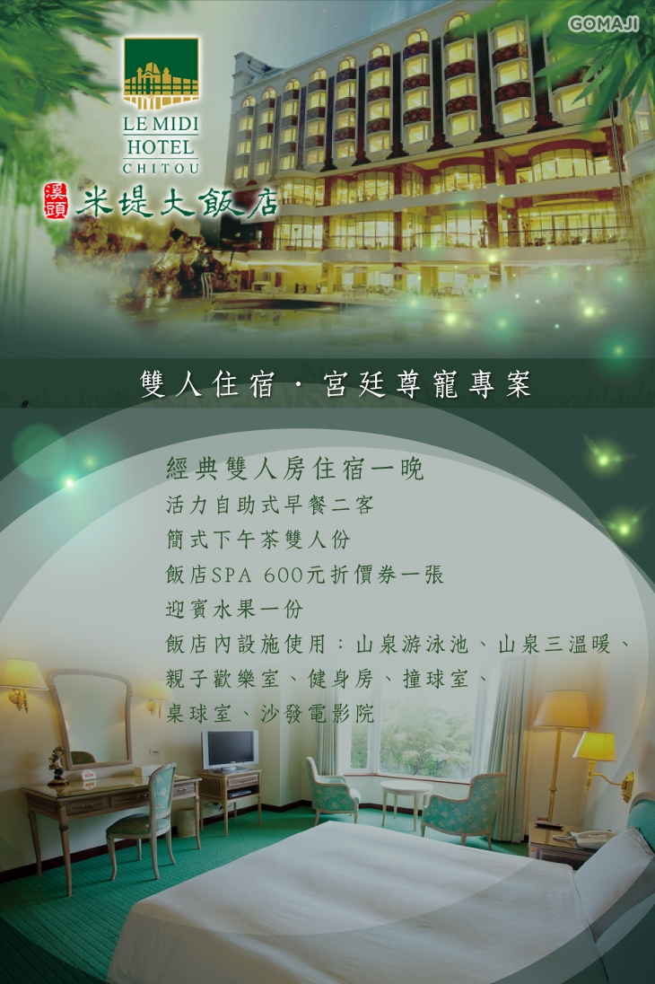 從歐洲進口、高價精造的仿古家具,以及精雕細琢的家具品味,擁有和法國皇室同等級的享受。耗資數億,打造歐式路易十四風情,其造型獨特,融合了歐洲藝術與休閒渡假的新古典主義造型,讓人恍若置身歐洲宮廷。何謂樂活?在米堤大飯店中,您可以親身體會!
