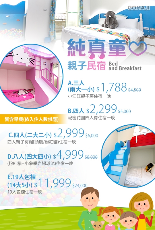 提供多種主題式的童趣套房,寬闊、潔淨的套房空間中,有著精緻的特色裝潢和可愛佈景。自然的溫度帶上淡淡的甜美與華麗,還有孩子們最愛的滑梯、球池等,在房間就能盡情暢玩,讓家長放心、孩子開心的歡樂天堂!