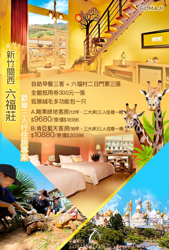 位於新竹縣關西鎮的「關西六福莊生態度假旅館」緊鄰「六福村主題遊樂園」旁,是以自然生態與草食性動物為主題規劃的飯店,採用挑高建築風格設計,感覺如同非洲肯亞的樹屋,具有曠野風情,使生態旅遊與樂園娛樂的動線完整貼合。
