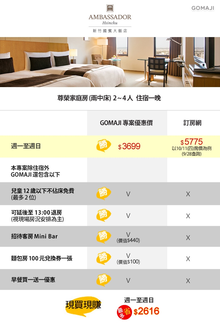 ★招待客房Mini Bar、麵包房100元兌換券、早餐買一送一優惠(請於入住時告知飯店櫃台)