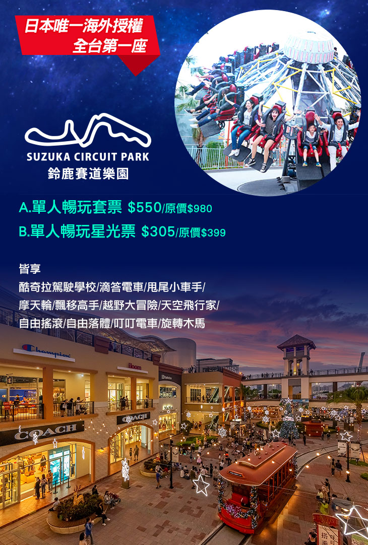 日本鈴鹿賽車場 SUZUKA CIRCUIT 經過海外授權,與「SKM PARK Outlets 高雄草衙」 是結合購物、遊樂園、美食等全方位的休閒空間,捷運草衙站2號出口一出來即可抵達,交通十分便利!另外,樂園園區有可愛的酷奇拉家族與大家見面,由原子小金剛作者-手塚治虫筆觸下創造的-酷奇拉家族,來自EG02星球的可愛恐龍將飛來樂園與地球孩子一起唱唱跳跳,趁假日來樂園與酷奇拉家族見面。