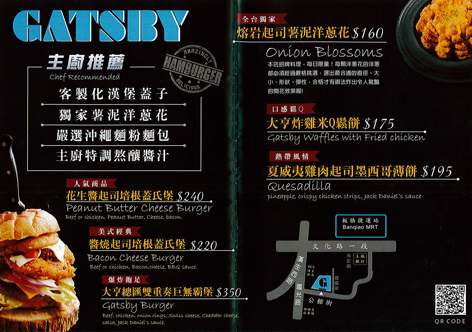 〝Gatsby 蓋子美式餐廳〞鄰近板橋捷運站,歡慶一週年開幕!堅持使用最新鮮的食材,自製的安心料理,帶來海外人氣商品,加上在地化創意,為〝蓋子〞的經典美味。此外,客製化多選擇的漢堡蓋麵包,使用嚴選沖繩麵粉麵包,引進海外人氣美食,招牌薯泥洋蔥花、大亨蓋氏堡、奶香米 Q 鬆餅等,最後成就獨一無二的美味。