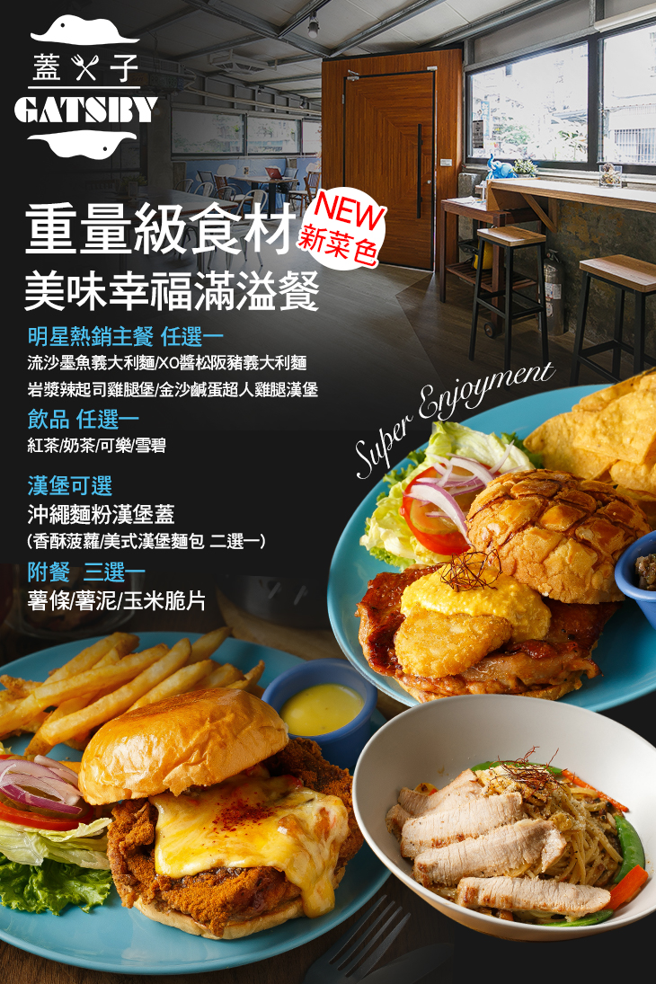 【Gatsby蓋子美式餐廳】鄰近板橋捷運站,經營一年多以來堅持使用最新鮮的食材,自製的安心料理,帶來海外人氣商品,加上在地化創意,為〝蓋子〞的經典美味。此外, 客製化多選擇的漢堡蓋麵包,使用嚴選沖繩麵粉麵包,引進海外人氣美食,最後成就獨一無二的美味。